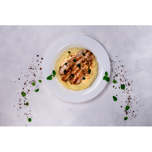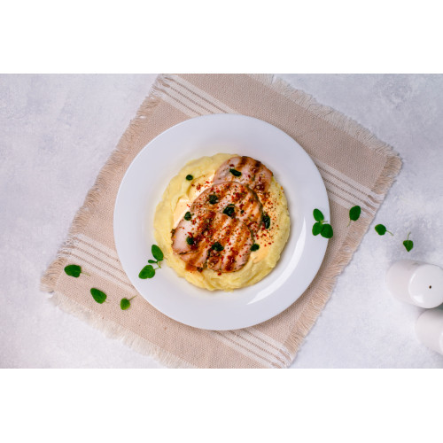 Chicken Fillet with Mashed Potatoes and Cheese Sauce is a complete ready meal for when you want a hot, filling dinner without cooking from scratch. Soft mashed potatoes made with cow’s milk 2.5% and butter 72% are served with juicy chicken fillet and a rich cheese sauce based on culinary cream 30%, cheddar cheese and parmesan cheese.