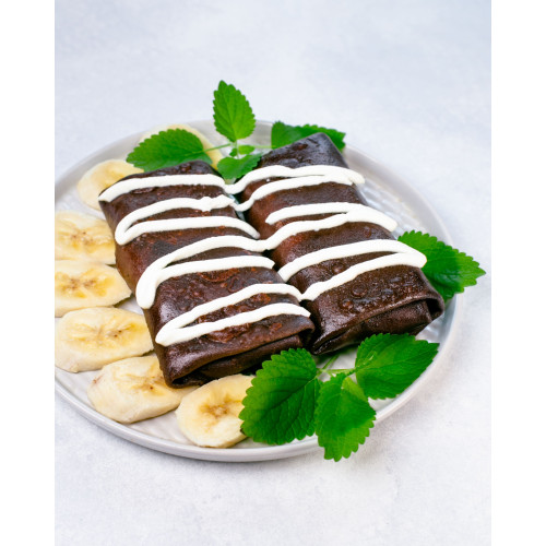 Chocolate Crepes with Cheese, Banana, and Nutella are rich dessert-style crepes with a decadent filling and a delicate cocoa batter. The base is made from milk, premium wheat flour, butter, chicken eggs, cocoa powder, vanilla paste, sugar and a pinch of salt, so the crepes fry up tender, elastic and pleasantly chocolatey.
