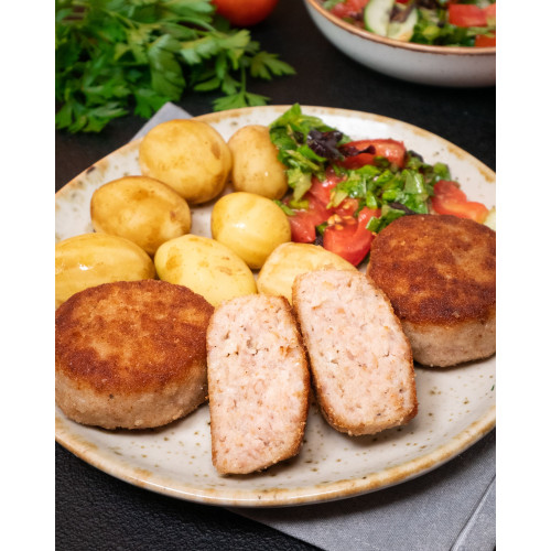 Chicken Cutlets are classic home-style chicken patties with a tender texture and clean, mild taste. The mixture is made from chicken fillet with bulb onion, long loaf and breadcrumbs, lightly seasoned with chicken eggs, salt and ground black pepper. After cooking, the cutlets are golden and slightly crispy outside and remain juicy and soft inside.