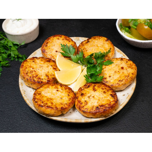 Salmon & Tilapia Fish Cutlets are light, tender fish patties made from a balanced mix of tilapia (42%) and salmon (18%). Grated carrot and onion add sweetness and juiciness, while refined sunflower oil, olive oil, salt and ground chili pepper give a delicate texture and a mild spicy note.