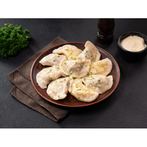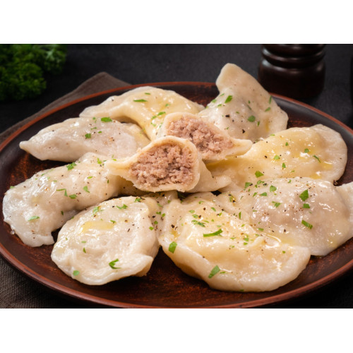 The dough from premium wheat flour and water stays soft and elastic after boiling, wrapping the meat filling in a thin, tender shell. Serve meat pierogy as a main course for lunch or dinner – they are especially delicious with butter, sour cream or fried onions, and pair well with fresh salads, pickles or light soups.