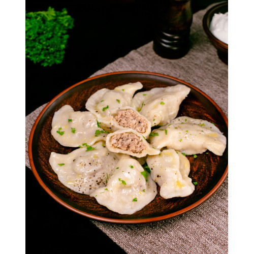 Meat pierogy (varenyky) are hearty Ukrainian dumplings with a rich, savory filling and delicate dough. The stuffing is made from deveined boiled beef of the highest grade, a little pork fat for juiciness and fried bulb onion, lightly seasoned with salt and ground black pepper. This gives a deep meat flavour and classic home-style aroma in every bite.