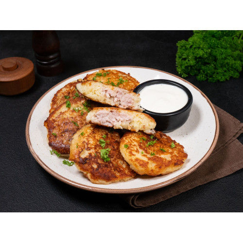 Meat Potato Fritters (Deruny) are hearty grated potato pancakes with a juicy meat filling inside each portion. The base is made from raw potatoes, bulb onion, chicken eggs, premium wheat flour and mayonnaise, giving the fritters a tender texture and a golden crust after frying.