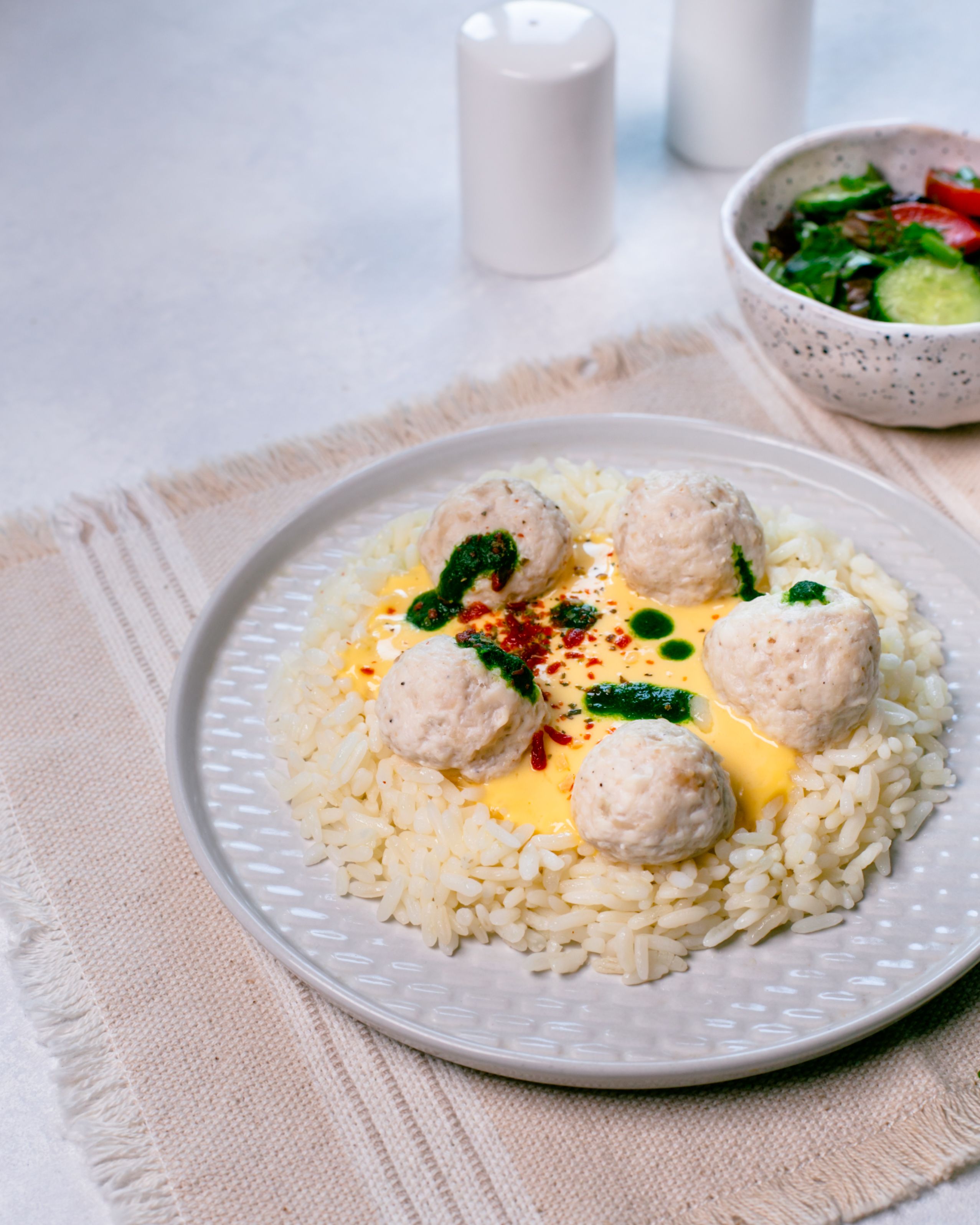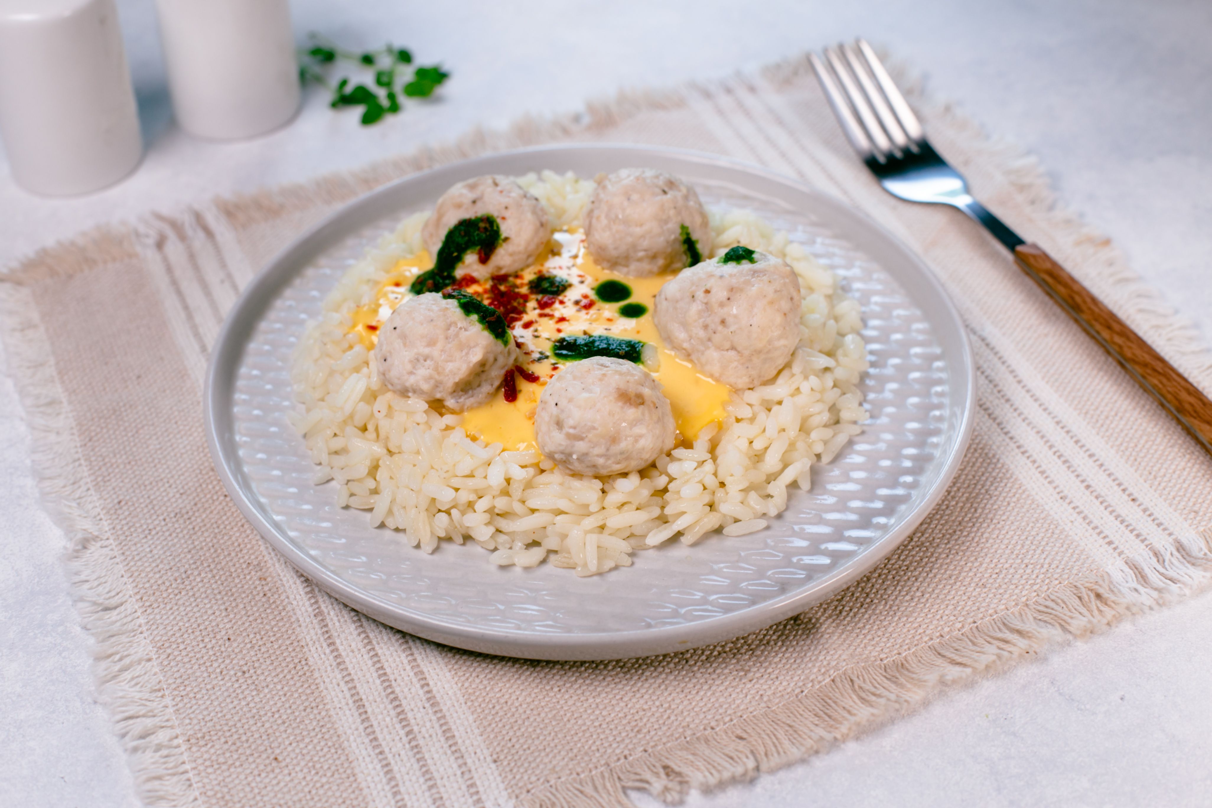 Chicken balls with rice and cheese sauce