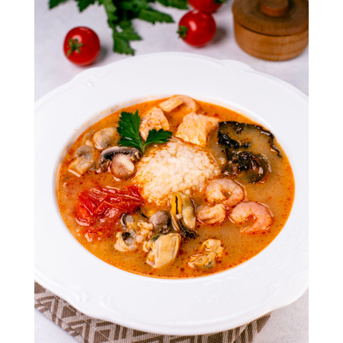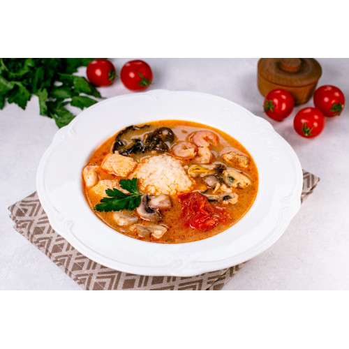Thai Soup “Tom Yum” with Coconut Milk is a classic spicy-sour Thai soup in a convenient frozen format. The base of fragrant chicken broth is enriched with coconut milk, giving the soup a creamy texture while keeping the bright, fresh taste of Thai spices.
